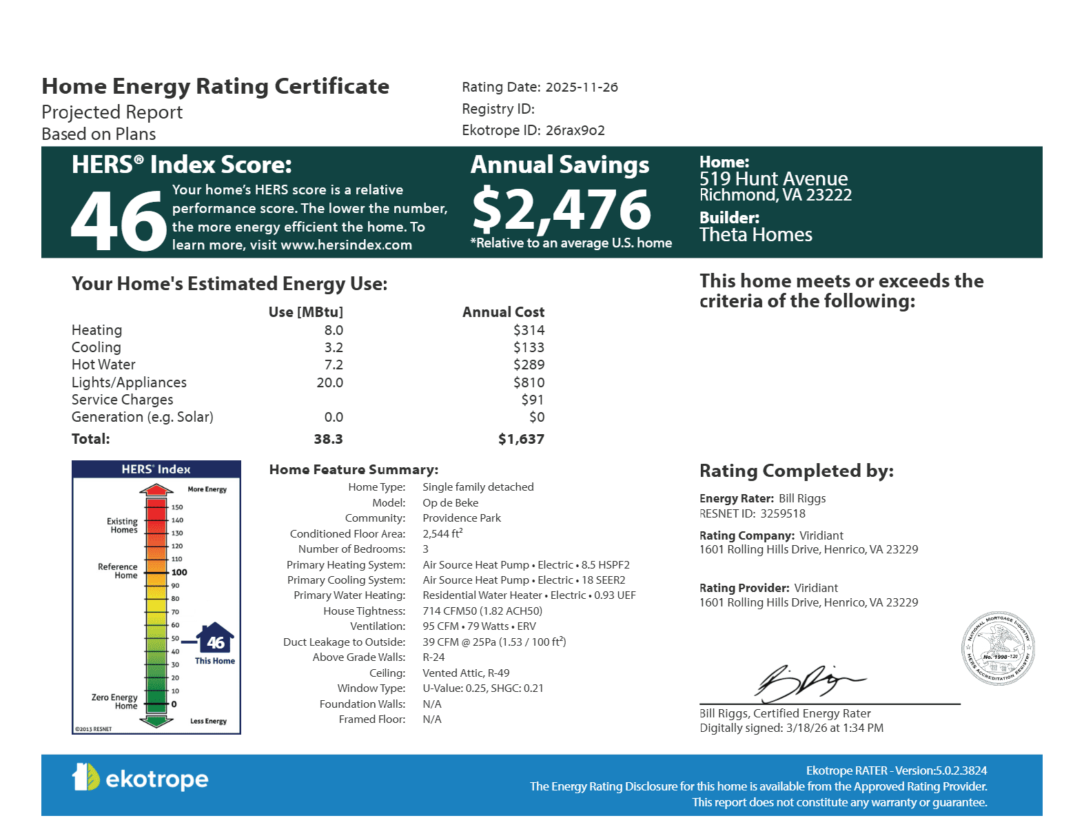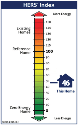 This custom home achieved a HERS rating of 46, which means it is approximately 54% more energy efficient than a comparable home built to standard energy code.